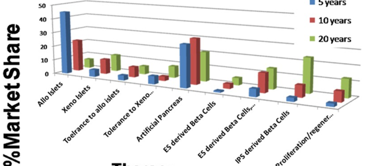 Imagen: Expected changes in β cell replacement over time. before the conclusion of the conference, a web based survey was completed by the participants seeking their individual opinion as to what portion of the β-cell replacement market would be captured by the existing and potential therapies discussed at the meeting. For each of the time horizons of 5, 10, and 20 years, respondents allocated predicted market share between 9 potential therapeutic options. The graph shows the average market share awarded to specific therapies at 5, 10, and 20 years.