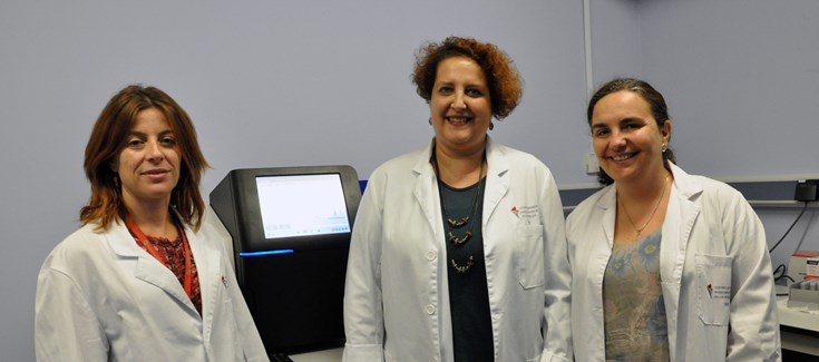 De izquierda a derecha: Las investigadoras Núria Jiménez, Mª José Gosalbes y Mª Pilar Francino junto al secuenciador donde se han analizado las muestras del estudio.