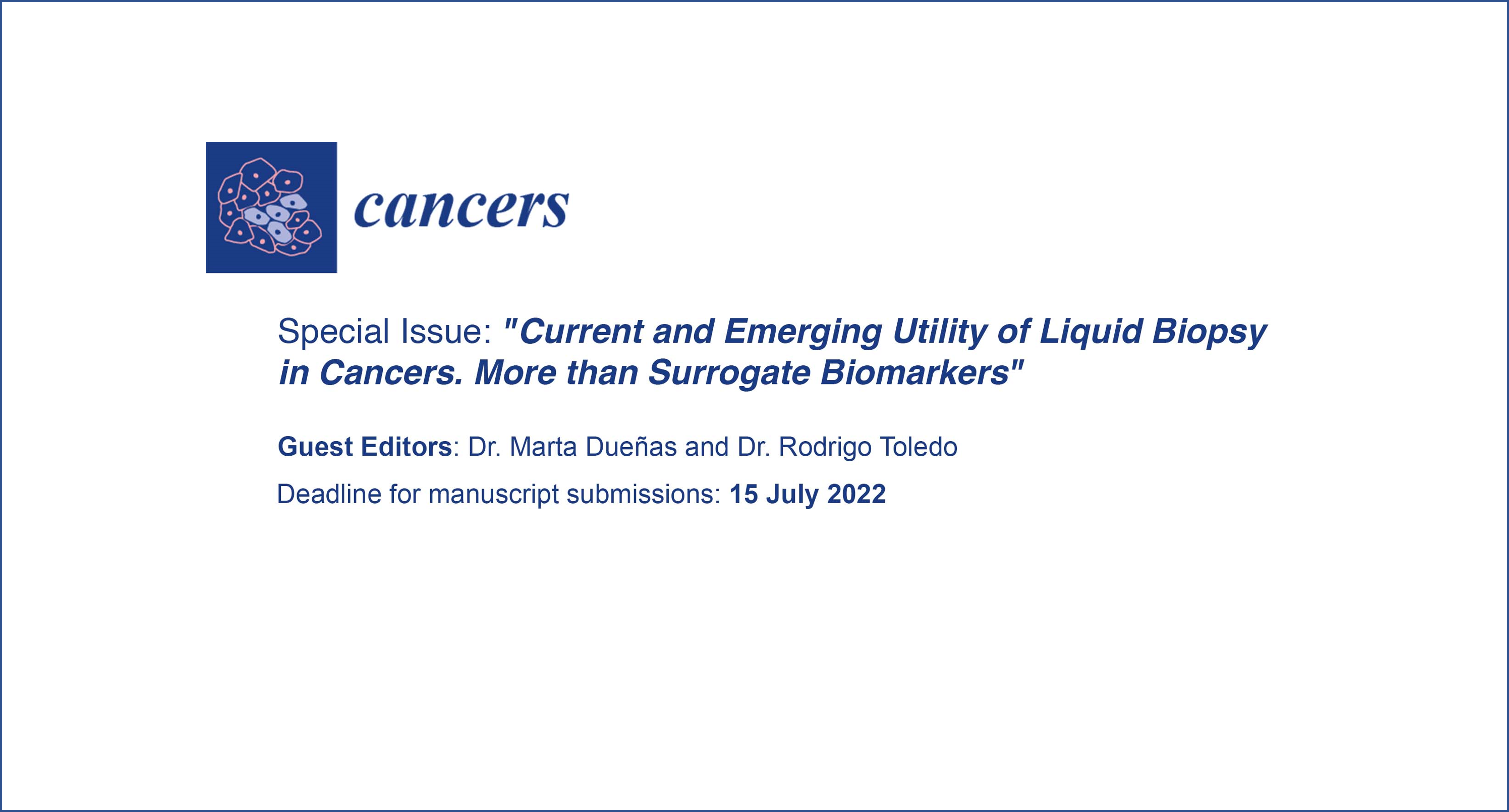 El título de la edición especial es "Current and Emerging Utility of Liquid Biopsy in Cancers. More than Surrogate Biomarkers" y se centrará en el estado del arte y los últimos hallazgos sobre biomarcadores tumorales circulantes, células tumorales circulantes (CTC), células tumorales híbridas (THC), así como ctDNA y ctRNA, análisis de proteínas, y evidencia clínica con respecto a la implementación de la biopsia líquida en la práctica clínica.