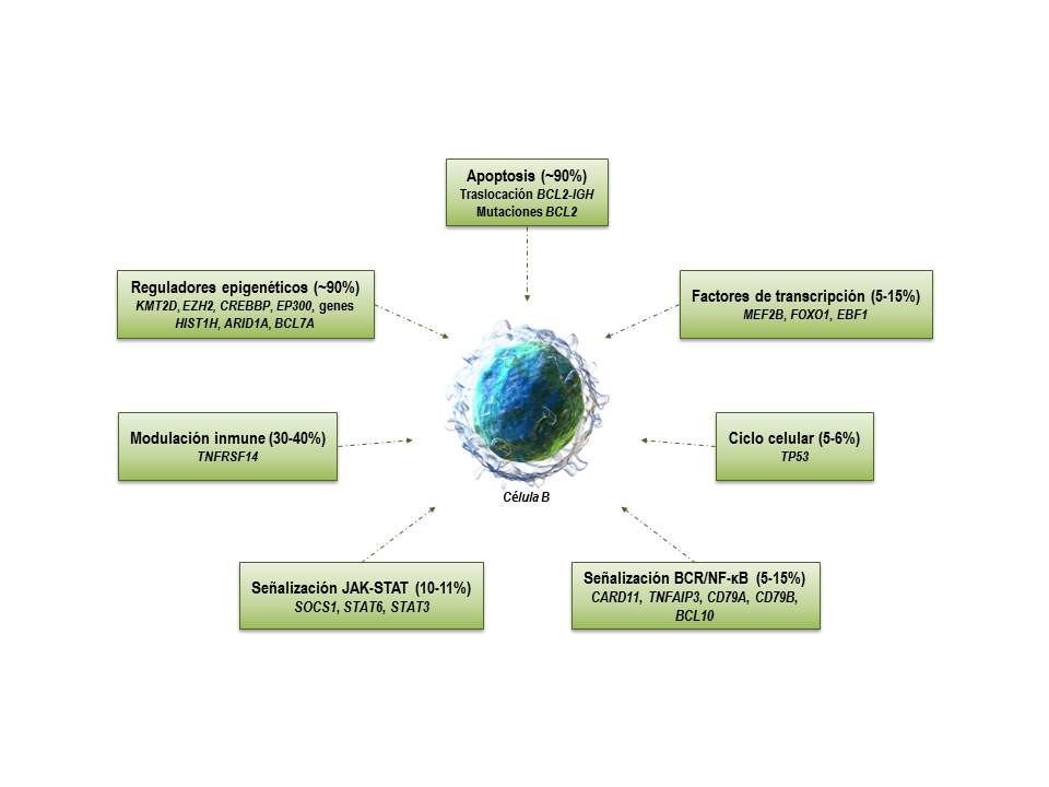 (*) Figura superior: Categorías funcionales comúnmente afectadas en linfoma folicular que reflejan la complejidad genética característica de esta neoplasia