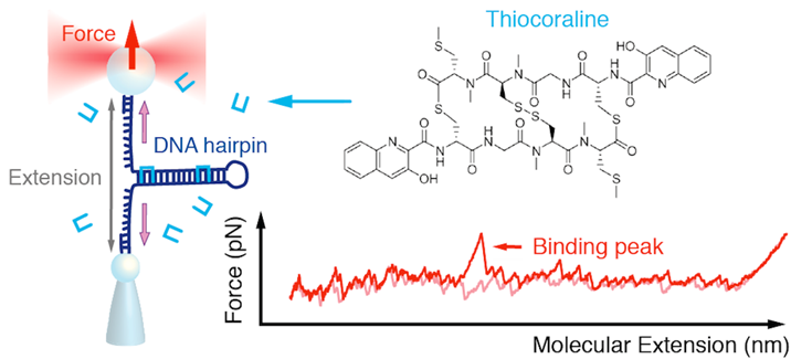 La publicación Single-molecule kinetics and footprinting of DNA bis-intercalation: the paradigmatic case of Thiocoraline, una colaboración entre los grupos de F. Ritort y F. Albericio, ha sido seleccionada por la Sociedad de Biofísica de España (SBE) como artículo del mes de marzo de 2015. En dicho estudio se han utilizado pinzas ópticas para caracterizar a nivel de molécula individual la termodinámica, la cinética y la selectividad de unión al ADN de la Tiocoralina (Figura, arriba), un bis-intercalador con potente acción anticancerígena.