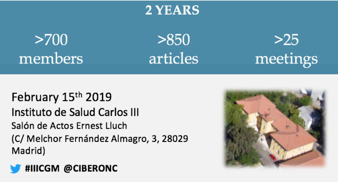 El próximo 15 de febrero se celebrará la III Reunión General de CIBERONC (#IIICGM), en el salón de actos Ernest Lluch del Instituto de Salud Carlos III de Madrid. El evento contará con la presencia de más de 100 miembros de CIBERONC, la mitad de ellos Investigadores Principales.