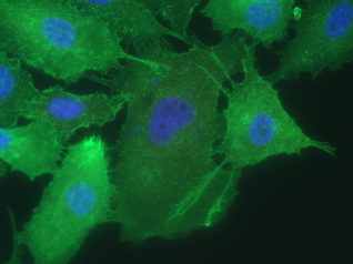 Imagen (*): Las células de cáncer de próstata que expresan PGC1A exhiben alteraciones del citoesqueleto compatibles con pérdida de la movilidad celular y la invasión. La tinción de faloidina se muestra en verde, la tinción nuclear en azul.