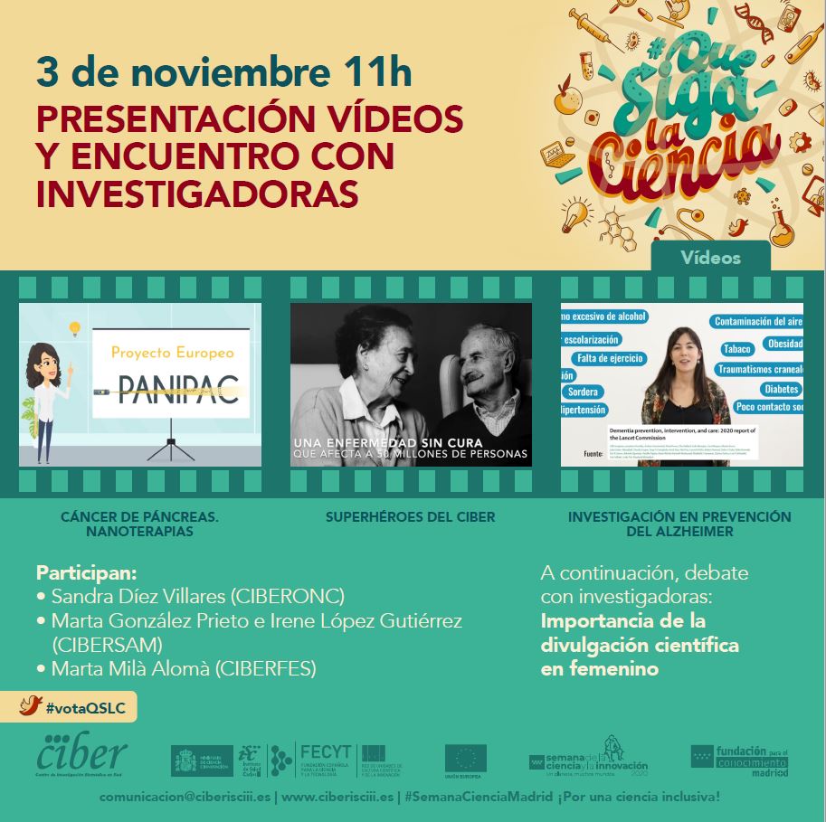 El vídeo sobre el proyecto de investigación PANIPAC presentado por Sandra Díez Villares, investigadora del CIBERONC, ha sido el seleccionado en la I Convocatoria de vídeos del CIBER para representar al CIBERONC en la campaña de redes sociales #QueSigaLaCiencia durante la Semana de la Ciencia de Madrid.